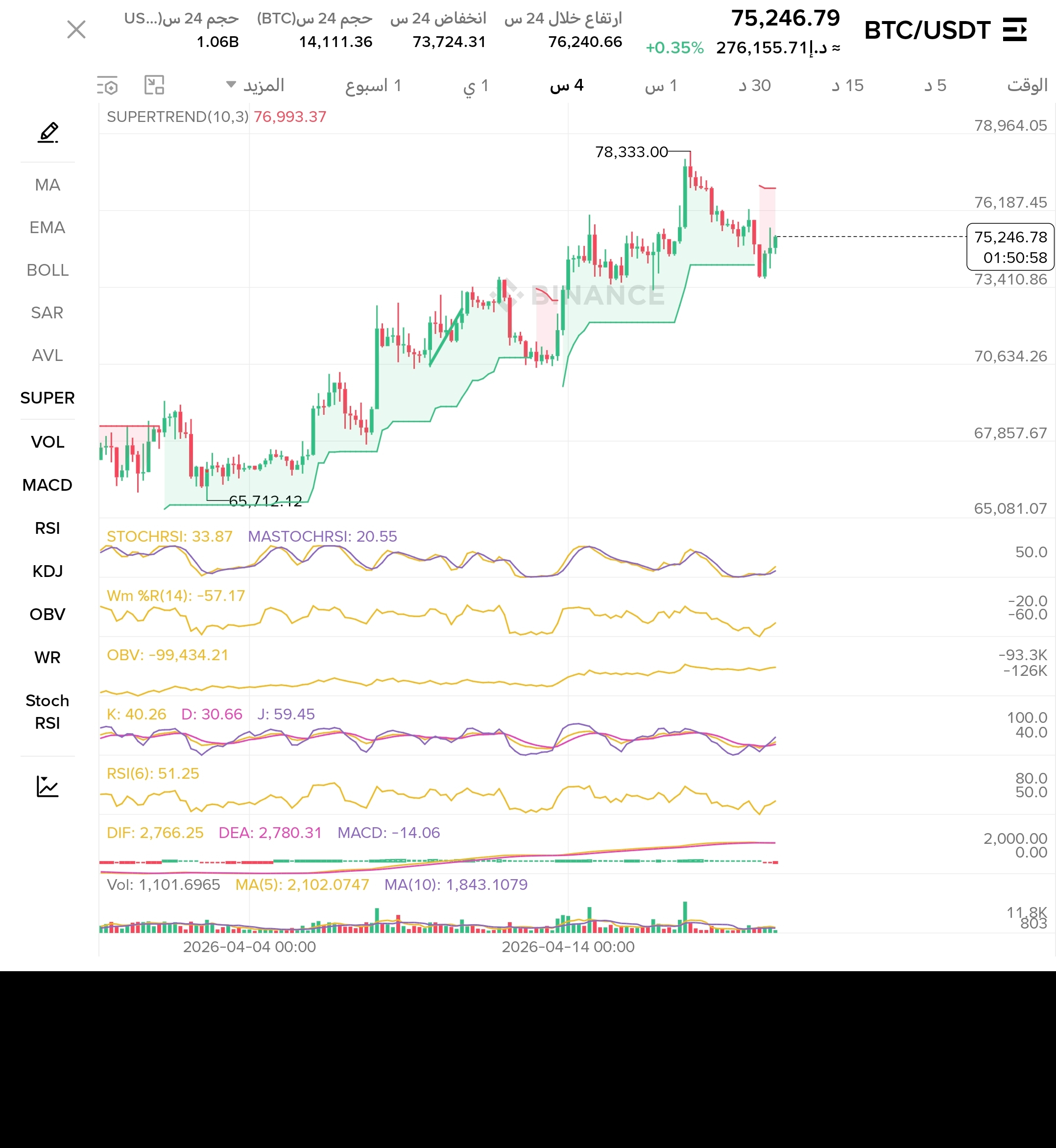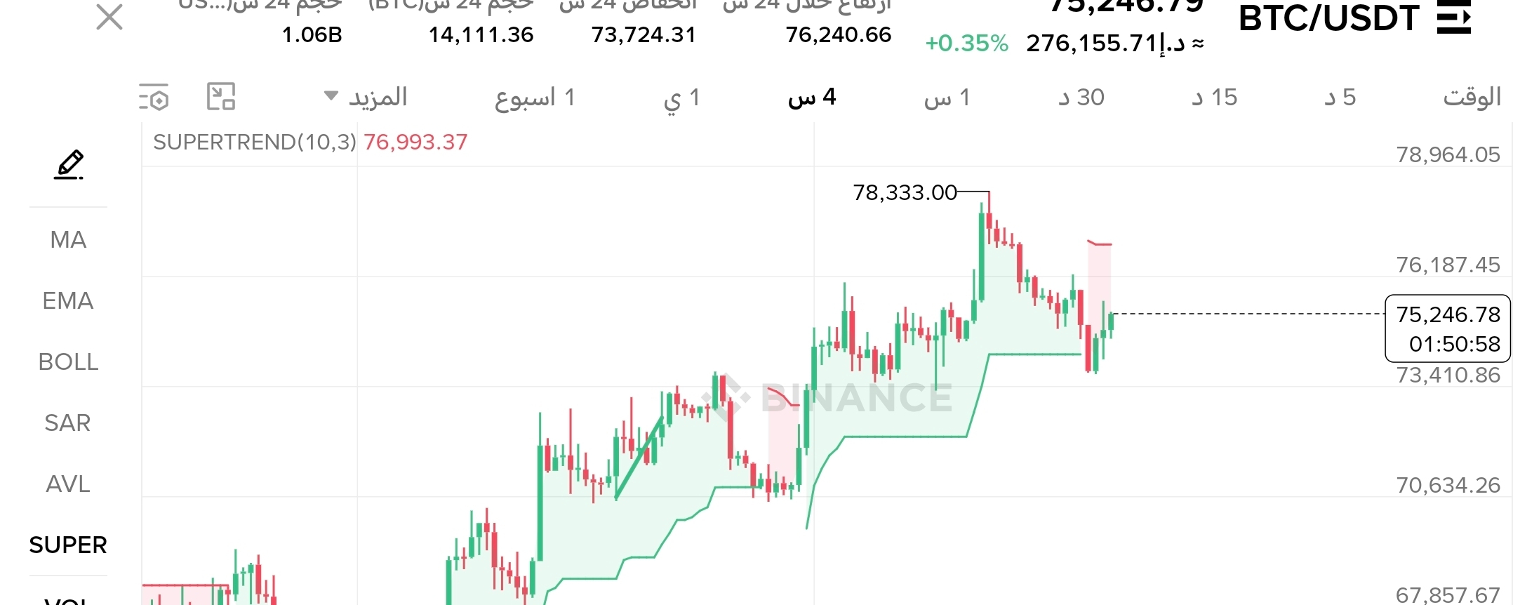 المقاومات: 76,240$ → 76,678$ (SAR) → 76,993$ (Supertrend) → 77,782$