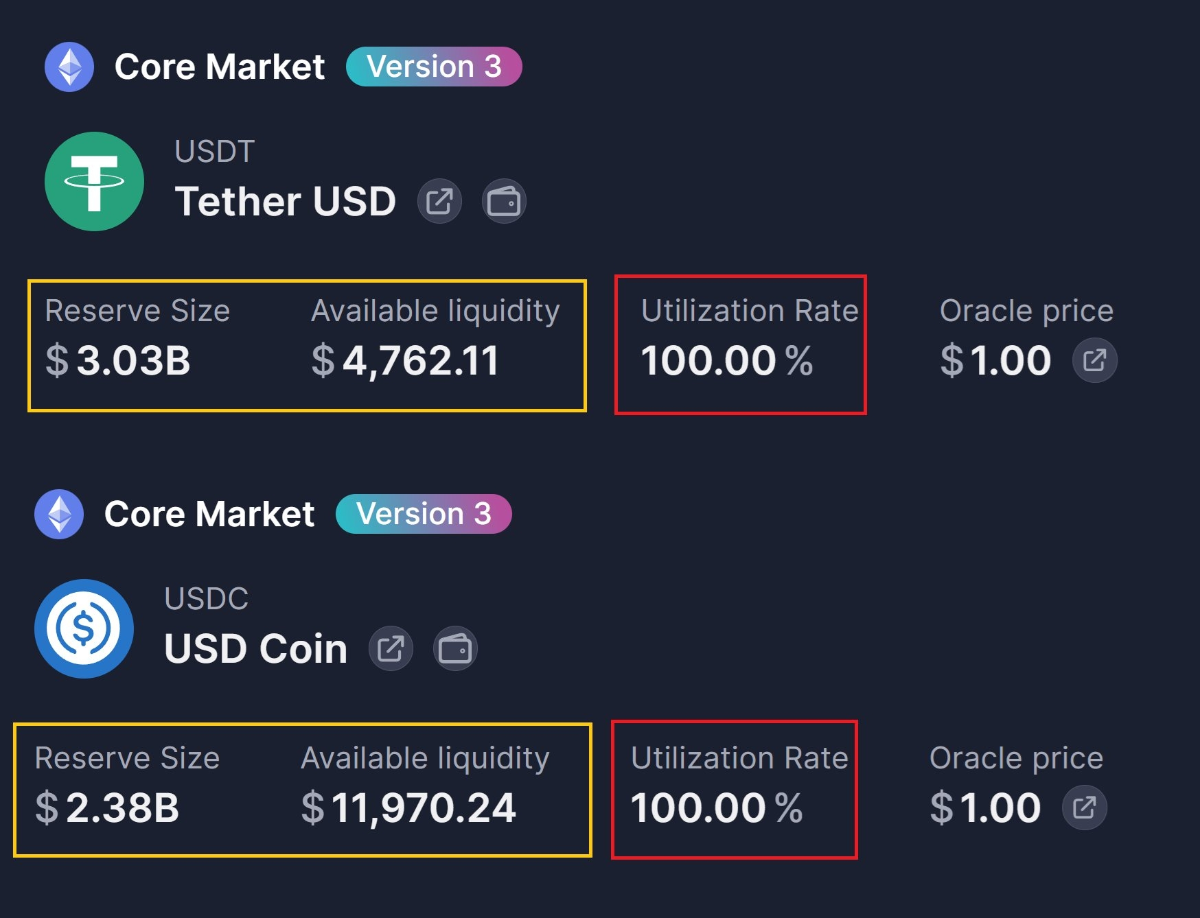 100 Procent Wykorzystania: Gdy prawdziwa wartość rynkowa rsETH natychmiast załamała się, wewnętrzna logika Aave opóźniła aktualizacje cen. Protokół wchłonął bezużyteczne zabezpieczenie, podnosząc wskaźnik wykorzystania puli WETH do dokładnie 100 procent, blokując prawdziwych depozytariuszy dostępu do ich funduszy.