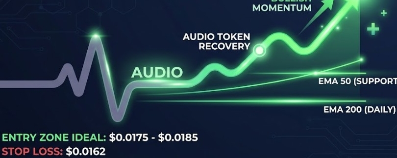 AUDIO muestra una estructura de recuperación técnica tras una consolidación prolongada. En el gráfico de 4H, el precio se mantiene por encima de la EMA 50, que actúa como soporte dinámico clave. La EMA 200 diaria ha comenzado a aplanarse tras una tendencia bajista, señalando una posible acumulación institucional. El RSI en 58 sugiere momentum alcista con espacio para crecer antes de la sobrecompra.
