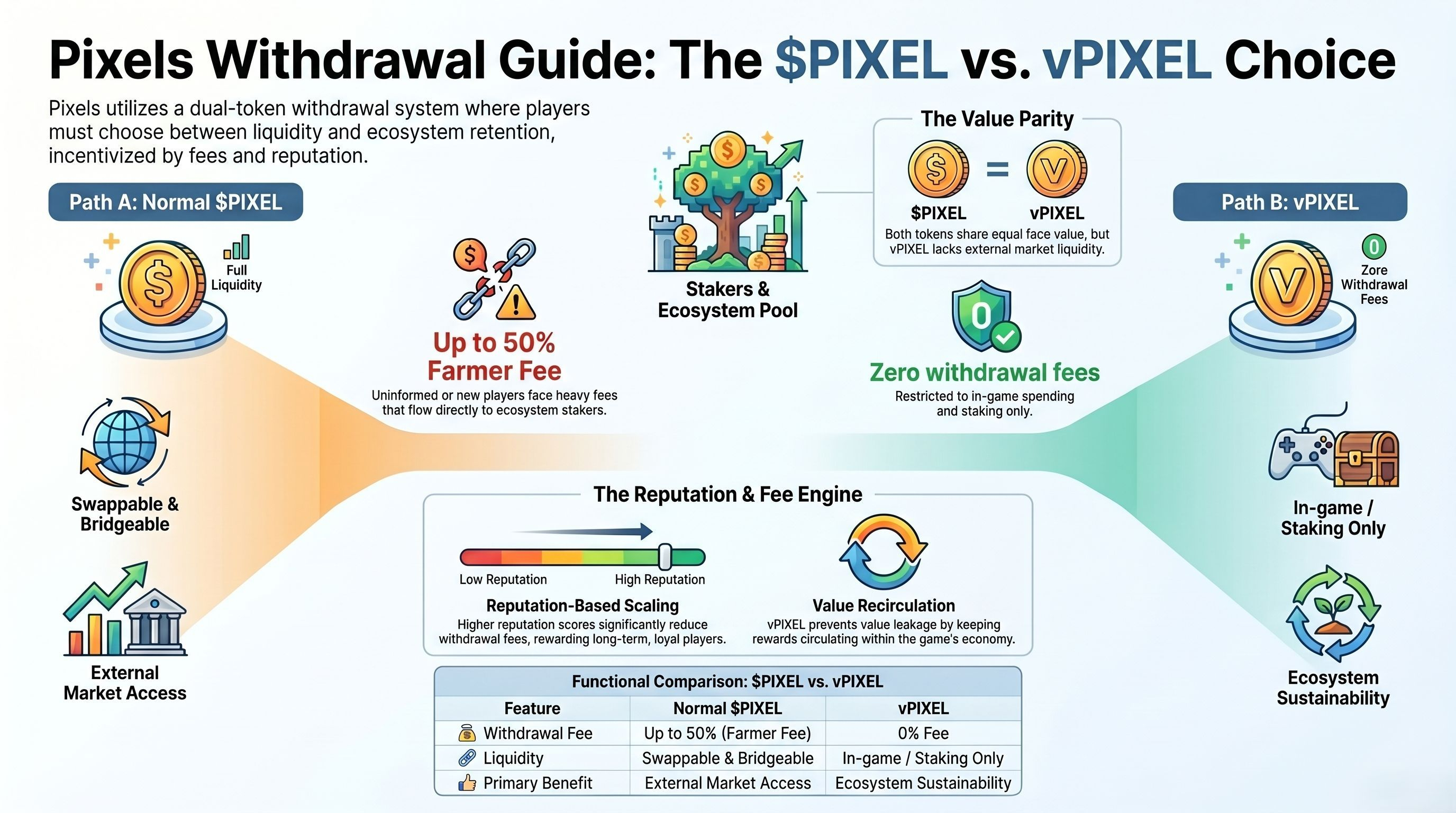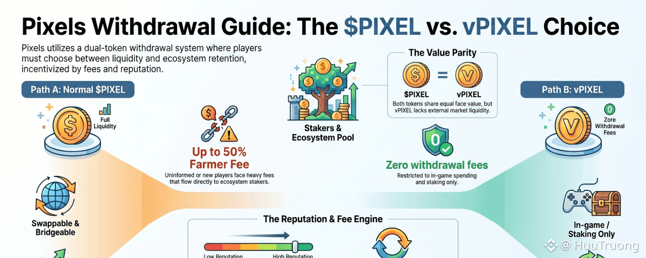 Bởi vì sản phẩm họ mô tả là có thật. Khi bạn rút tiền lãi từ Pixels, bạn sẽ có hai lựa chọn. Nhận PIXEL thông thường và trả Phí Người Trồng (Farmer Fee) lên đến 50%, số tiền này sẽ được phân bổ lại cho những người đặt cọc. Hoặc nhận vPIXEL với phí bằng không, một token có giá trị tương đương nhưng chỉ có thể được sử dụng trong game hoặc đặt cọc, không thể hoán đổi hoặc chuyển đổi qua cầu nối, và không có cách nào quay lại PIXEL thông thường mà không cần nạp lại vào game. Hai lối thoát. Cùng một khoản thu nhập. Hậu quả hoàn toàn khác nhau tùy thuộc vào lựa chọn của bạn và lý do tại sao.
