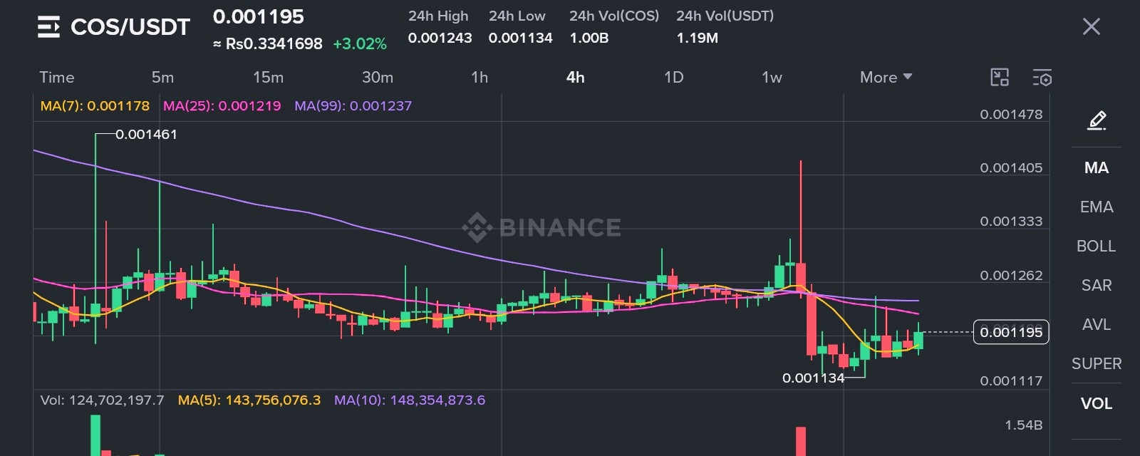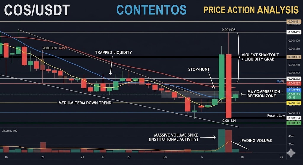 Cast your eye back to the chart's left side — COS previously traded up at 0.001461 in early April before a steady, grinding decline through mid-month. That peak now acts as distant overhead resistance. The MA(99) has been in a persistent downtrend throughout the entire visible chart period, which tells you the medium-term trend is still not in buyers' favor.