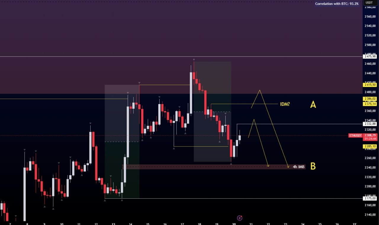 $ETH Цена образовала локальный слом, а учитывая 93,2% корреляции к #BTC, мы можем опираться именно от вероятной дозаправки от верхнего IDM и целей ниже — на 2,250$, в сторону 4h IMB.