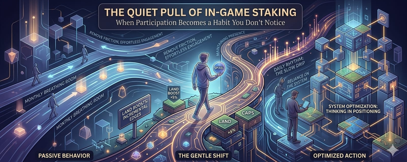 I keep finding myself circling back to this feeling—subtle, almost easy to ignore—that in-game staking isn’t just a feature sitting there waiting to be used, but something that quietly shapes the way we behave without asking for attention. It doesn’t interrupt you, doesn’t demand effort, doesn’t even try to impress. Instead, it just runs in the background, steady and patient, like it knows you’ll eventually adapt to its rhythm without realizing when that shift actually happened.