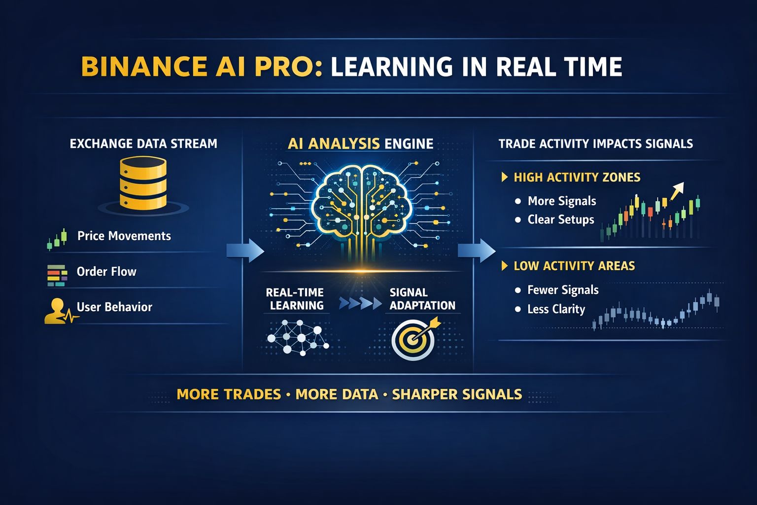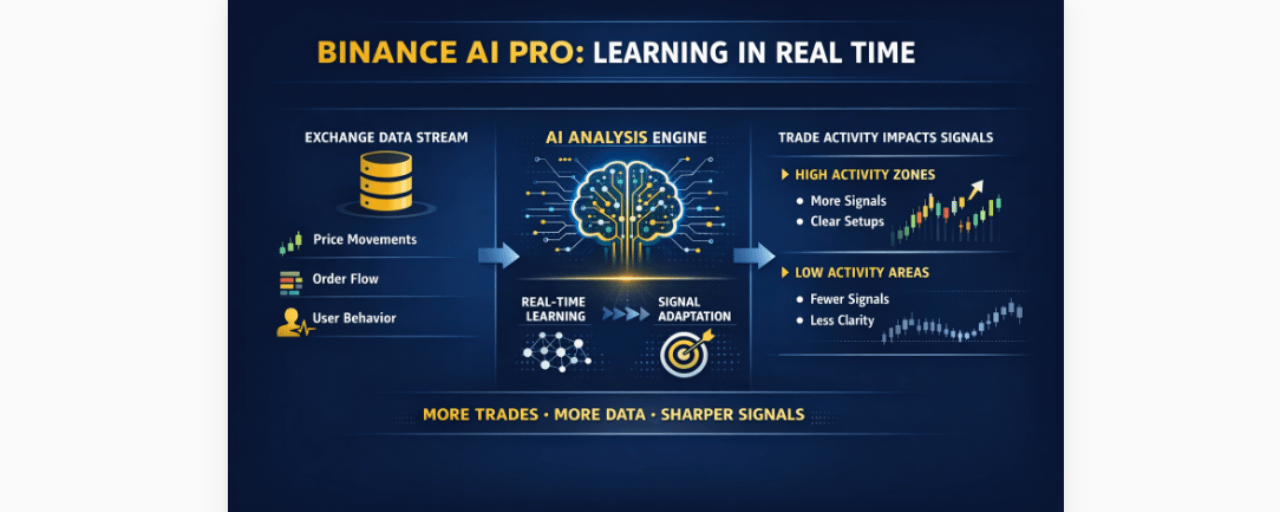 Điểm quan trọng ở đây là Binance AI Pro không hoạt động như một bot bên ngoài thị trường. Nó nằm trực tiếp trong hệ sinh thái Binance, nơi dữ liệu giá, order flow, execution và hành vi người dùng được ghi nhận trong cùng một hệ thống. Điều này làm cho vòng phản hồi rất ngắn: mỗi hành vi giao dịch không chỉ là output, mà đồng thời trở thành input gần như real-time cho chính hệ thống.