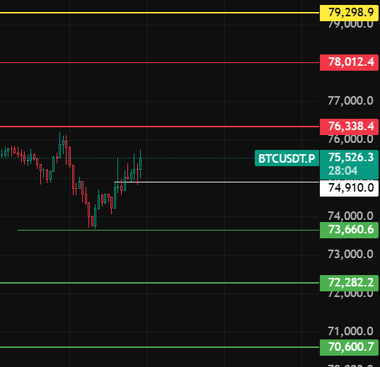 BTC w nocy zwraca uwagę na 74900, tylko jeśli poziom 1-2 godziny nie spadnie poniżej tej wartości, to mały poziom byków nadal będzie silny, kontynuuj w górę w pobliżu poziomów 76340-78000-79300 czekając na krótką pozycję!