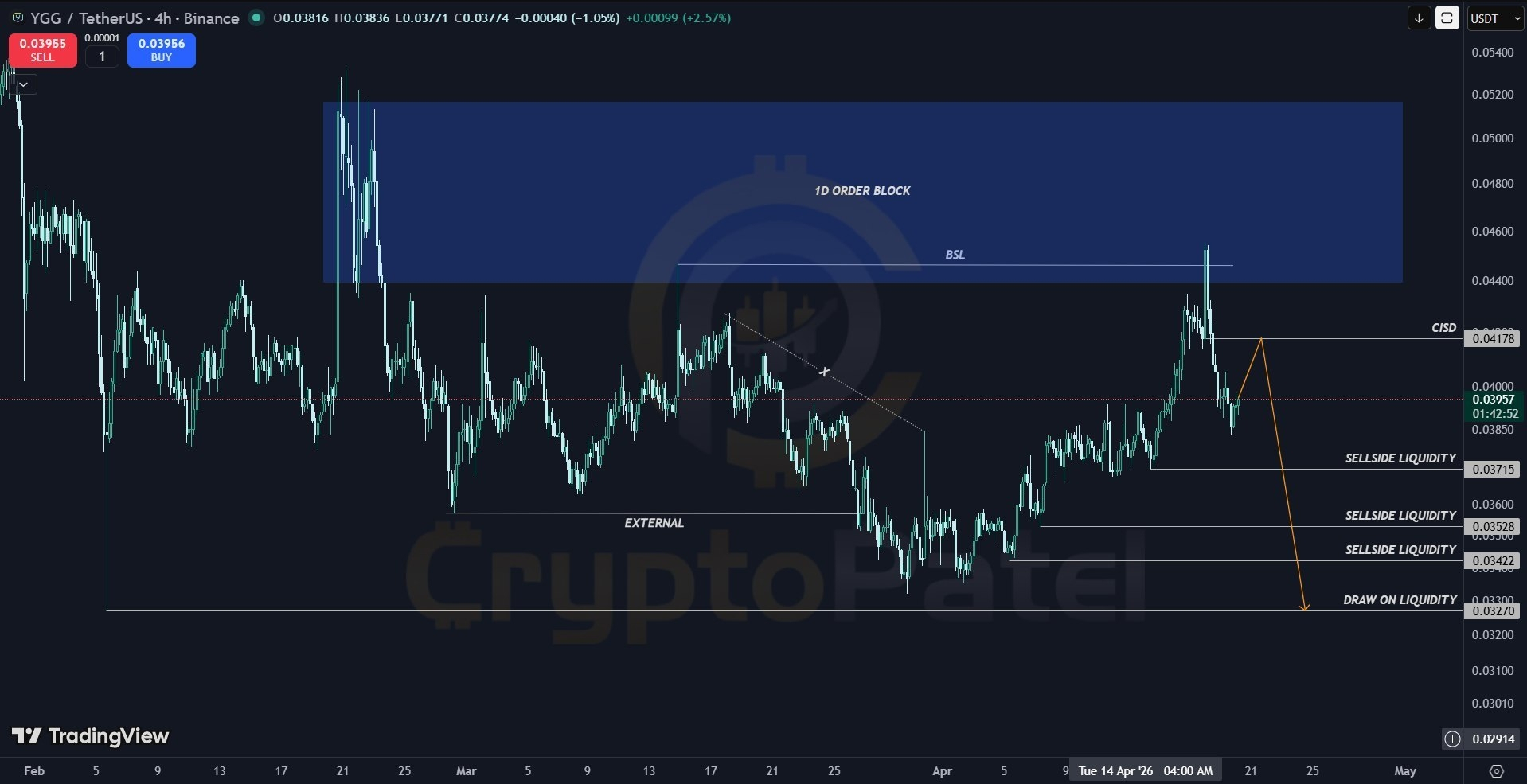 Bearish bias. Wait for retrace into the $0.0417 zone and confirmation (weak candles / rejection) before entering toward sell-side liquidity.