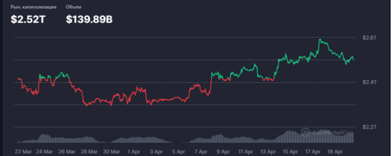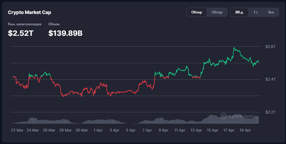 BTC — ~75 324 USD (на утро 20 апреля, лёгкое снижение за сутки, но недавно пробивал 76 000+ USD). Рыночная капитализация ~1,33 трлн USD.