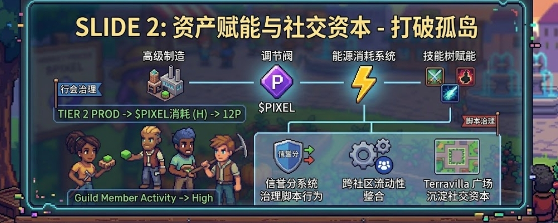 中立地观察其社交属性,@Pixels 的公共广场(Terravilla)更像是一个去中心化的信息集散地和资源交易所。在这里,玩家通过交换稀缺资源、组建利益一致的行会,将原本冰冷、孤立的链上地址转化为了有温度、有博弈、有协作的社交关系。这种“社交资本”的沉淀,为 $PIXEL 提供了除金融投机价值外的第二层核心属性——社交入场券与社区治理权。