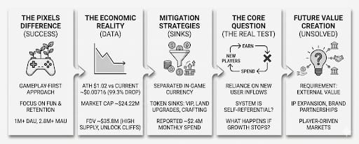 Most Web3 games collapse because they’re built like financial loops disguised as games. Pixels leaned the other way. Gameplay first, extraction second. Farming, progression, social loops these weren’t just mechanics, they were the reason to log in. That’s how it managed to scale to over 1M DAU and 2.8M MAU after moving to Ronin, with earlier data showing 180K+ DAU in 2023 and later milestones like 5M lifetime wallets and 200K+ VIP users.