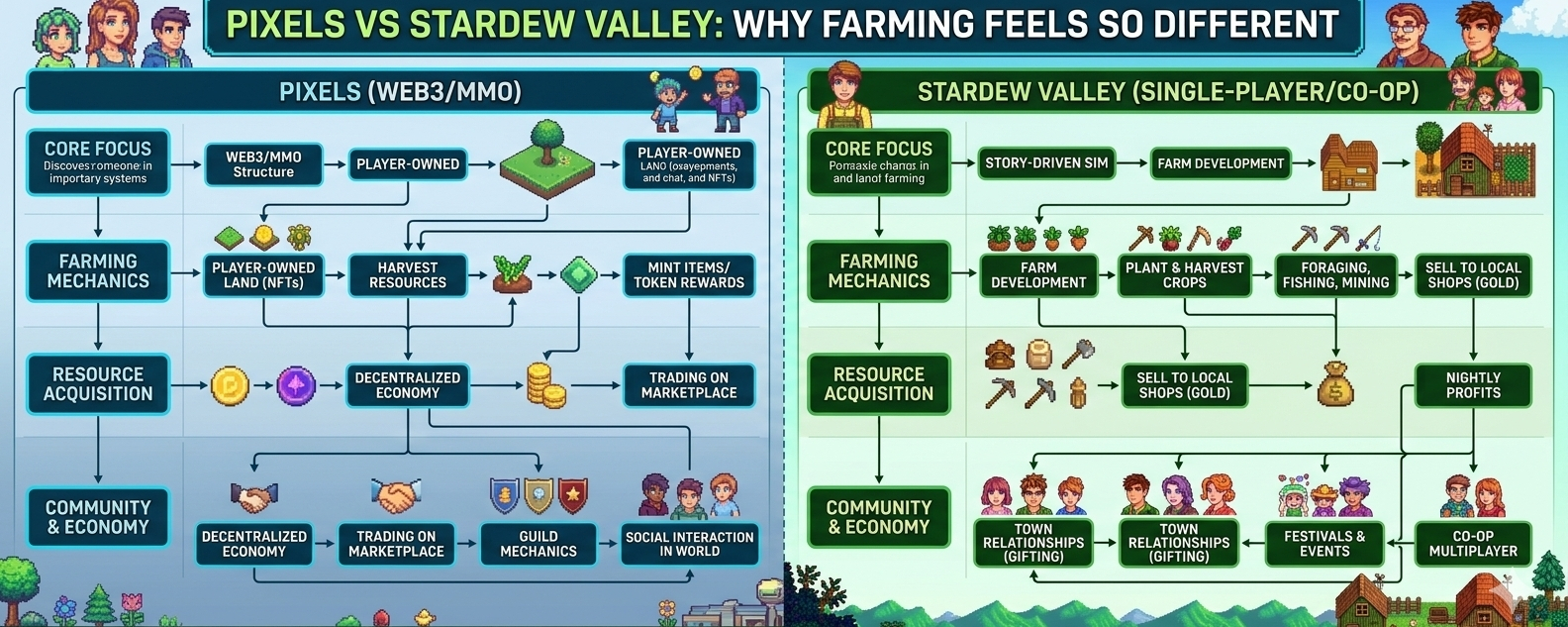 If you’ve spent time in both Pixels and Stardew Valley, the difference shows up pretty quickly. It’s not just Web3 vs traditional. It’s more about why you’re even farming.