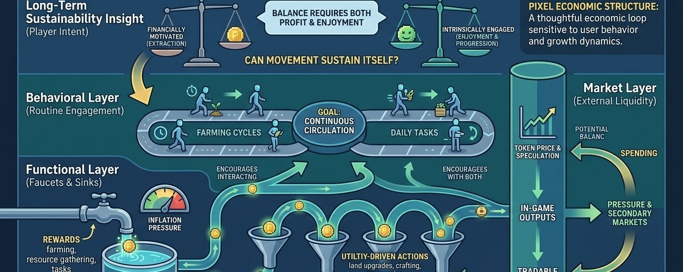 In conclusion, Pixel is structured around a relatively thoughtful economic loop that tries to balance token issuance with enforced utility. The mechanics are not inherently flawed, but they are highly sensitive to user behavior and growth dynamics. Its success depends on maintaining equilibrium between earning and spending while keeping players engaged for reasons beyond short-term financial gain.