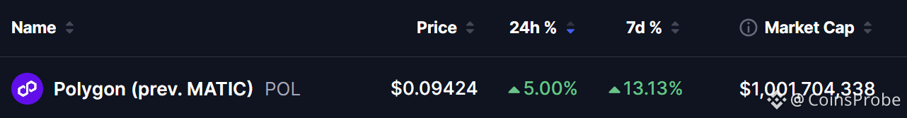 As of April 2026, Polygon’s native token POL is showing early signs of recovery after a prolonged downtrend. The token is currently trading around $0.0942, posting a +5% daily gain and +13% over the past week, with its market capitalization climbing to approximately $1 billion.