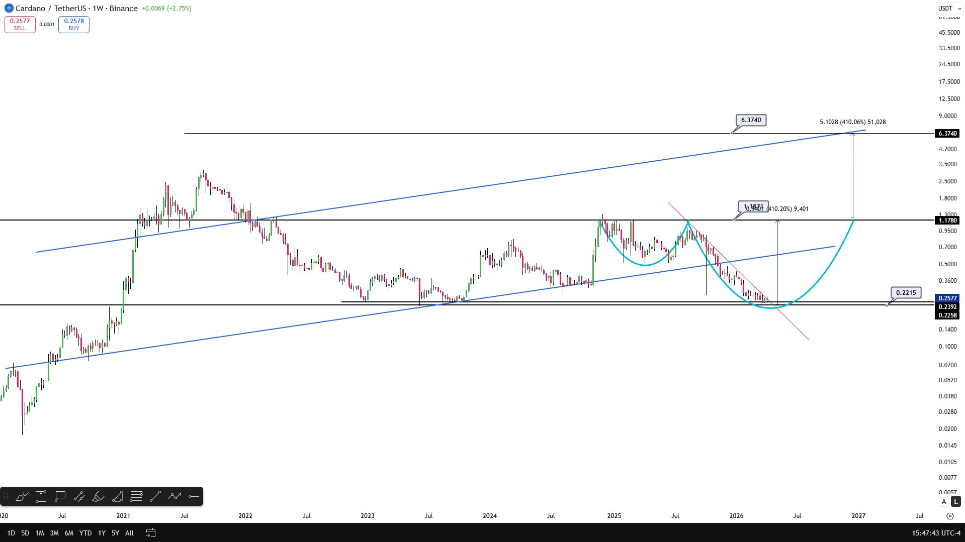 Średnioterminowy cel to górna granica przedziału cenowego, w którym Cardano handlowało od marca 2022 roku. Obszar ten odpowiada znacznikowi ceny $1.178, co stanowi wzrost o 379% w porównaniu do obecnej ceny $0.246.