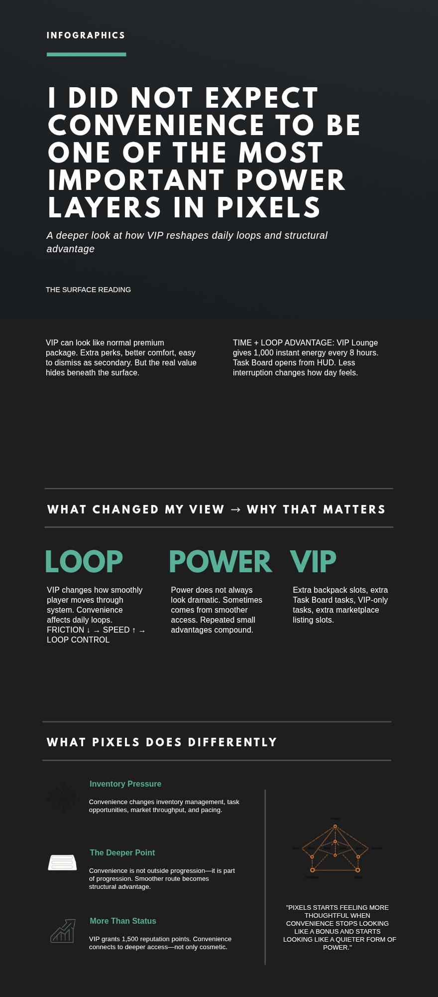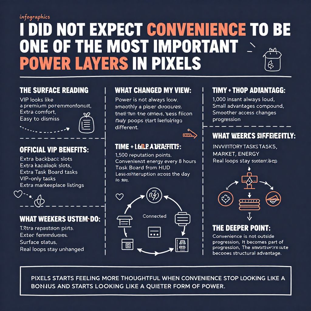 Usually, when people talk about power in a game economy, they talk about the obvious things first. Land. Token holdings. Rare items. Big rewards. That is the surface layer, and honestly, that is where I was looking too. But the more I sat with Pixels’ official material, the more I started feeling that one of the quieter power layers here is not raw ownership at all. It is convenience. Not convenience in the soft, forgettable sense. Convenience in the sense that it changes how smoothly you move through the system, how often you get opportunities, and how much friction the game removes for you over time. That is where this started feeling more serious to me.