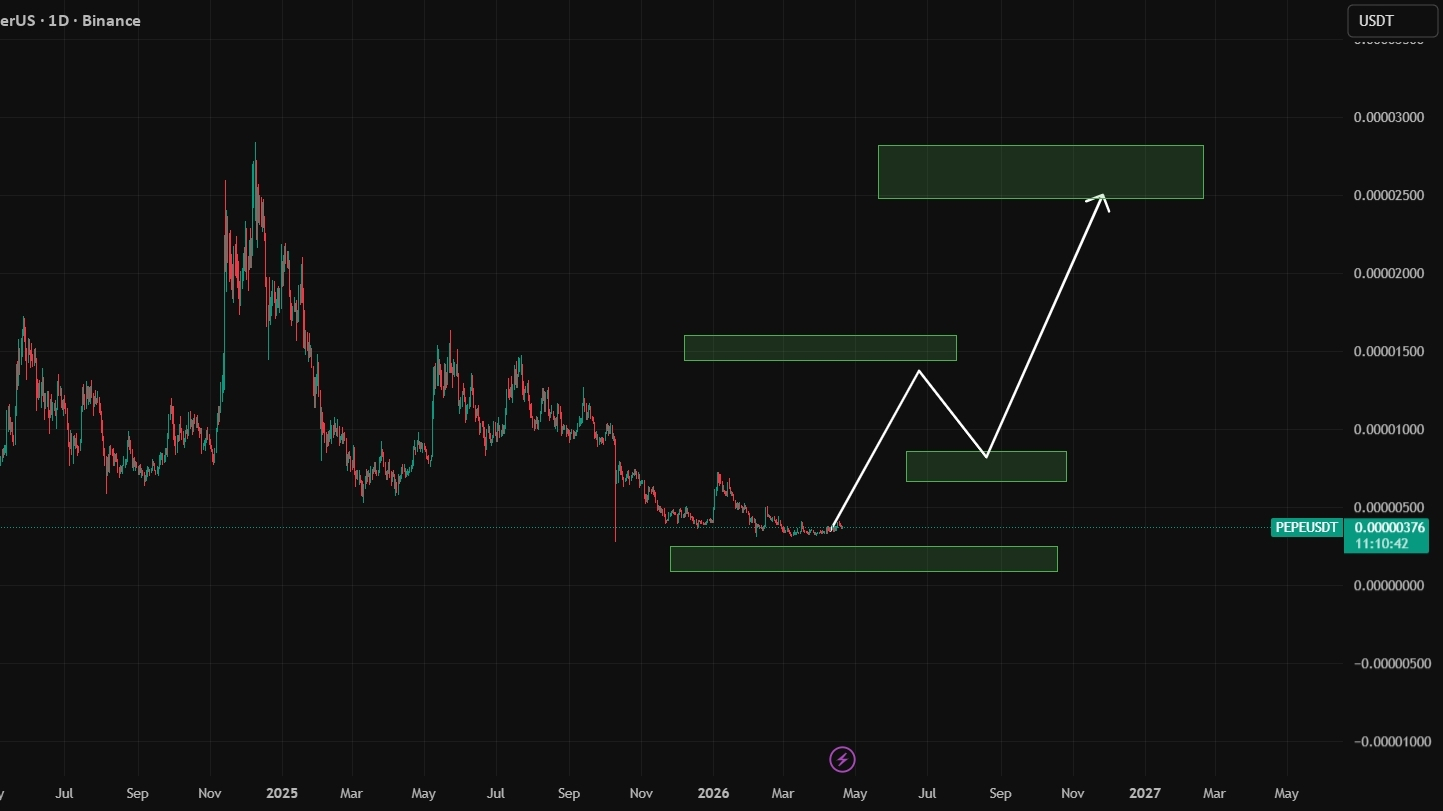 PEPE PEPEUSDT jest notowany na poziomie 0.00000376 USD, wzrastając o 3.01% w ciągu dnia. Wykres 1D pokazuje wyraźną strukturę akumulacji po długim cyklu spadkowym od szczytu pod koniec 2024 roku.