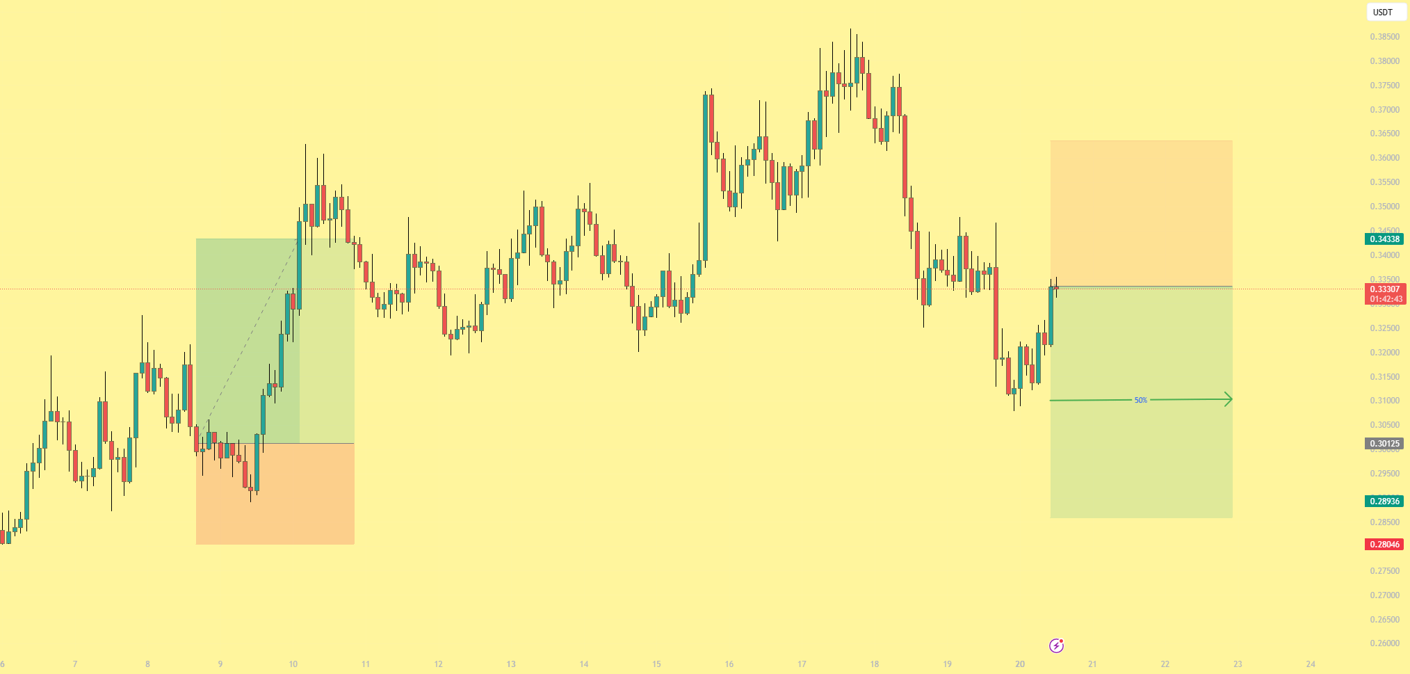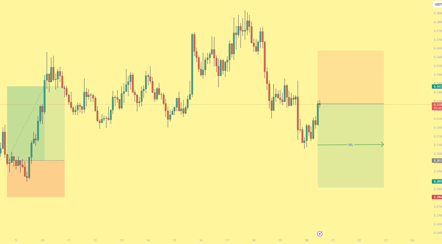 Ruch mierzony na poziomie 50% — zielona strzałka oznacza cel 50% retracement całego rajdu. Po parabolicznych ruchach, pierwsza noga korekcyjna zazwyczaj retrakuje 50–61.8% impulsu. To stawia cel w okolicach 0.310