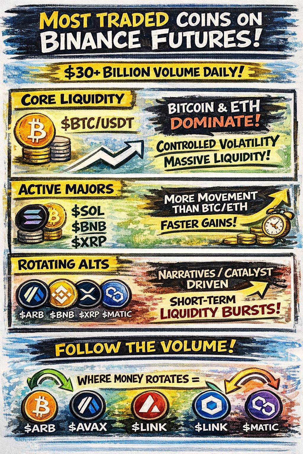 Then there’s the final layer the most misunderstood one which is rotating high-volume altcoins. These are coins like ARB, AVAX, LINK, MATIC, and even newer or trending tokens that temporarily surge in futures volume. Their behavior is driven almost entirely by narratives and catalysts listings, partnerships, hype cycles, or social momentum.