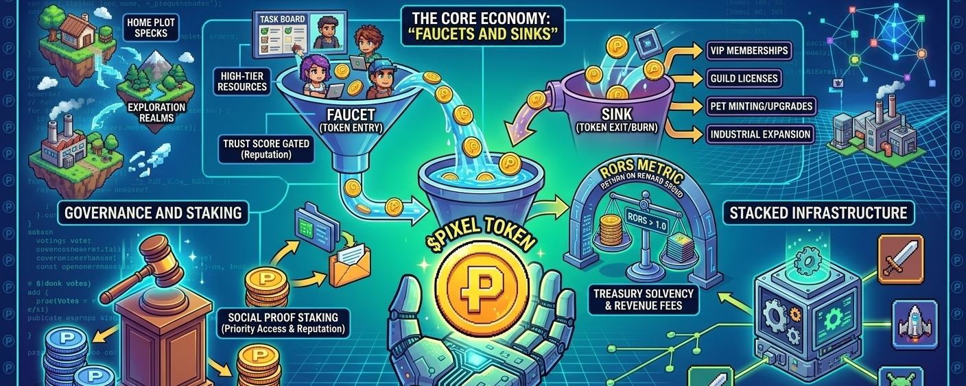 The PIXEL token operates as the premium currency within a dual-currency system (alongside off-chain "Coins"). The ecosystem is balanced by two opposing forces: