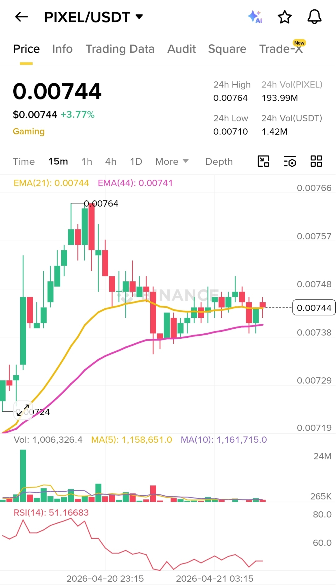 This real-world utility is exactly why we are seeing such resilient price action. If you look at the 15M chart, you can see that every time we dip toward the support, the buy-side volume picks up. My time in the game today confirmed that this isn't just "bot noise"—it's real community interest. I am watching the 0.00721 resistance closely; if the in-game activity continues at this rate, a breakout is inevitable.