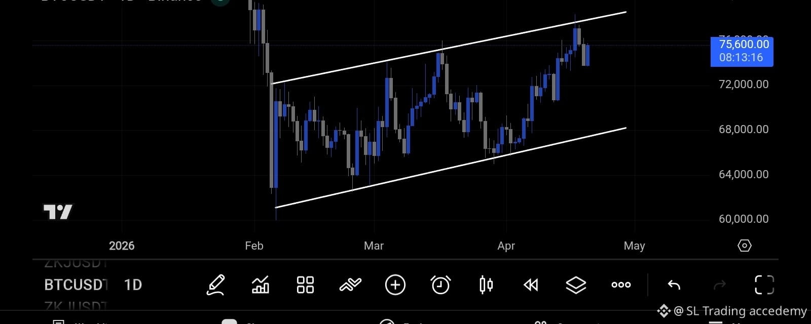 Price is near the top of the channel (~75.6K area)