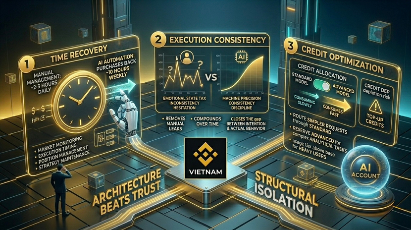 Pierwsza to wartość czasowa. Binance AI Pro zajmuje się monitorowaniem rynku, czasowaniem wykonania, zarządzaniem pozycjami i utrzymywaniem strategii w sposób ciągły. Dla tradera, który w przeciwnym razie spędzałby dwa do trzech godzin dziennie na tych zadaniach, narzędzie kupuje z powrotem znaczący czas. Przy $29.99 miesięcznie, stawka za godzinę tego odzyskiwania czasu jest niezwykle niska w porównaniu do niemal każdej rozsądnej wyceny profesjonalnego czasu. Jeśli narzędzie rzeczywiście zmniejsza koszty aktywnego zarządzania, subskrypcja uzasadnia się sama w sobie tylko na podstawie oszczędności czasu, zanim dotknie pytania o wydajność handlową.