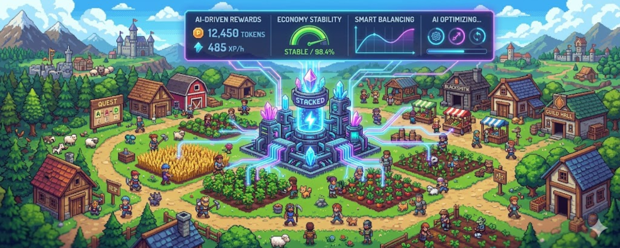 Stacked hoạt động như một lớp hạ tầng ở giữa - theo dõi hành vi người chơi cả on-chain lẫn off-chain, phân tích engagement theo thời gian thực, tự động tối ưu reward logic, và chống bot, chống farm. Trung tâm của tất cả là một AI game economist với cách tiếp cận hoàn toàn khác: reward không còn cố định cho tất cả mọi người mà thay đổi theo hành vi, theo thời điểm, theo đóng góp thực tế của từng người chơi. Không phải ai chơi cũng kiếm giống nhau và chính điều đó làm hệ thống bền hơn.