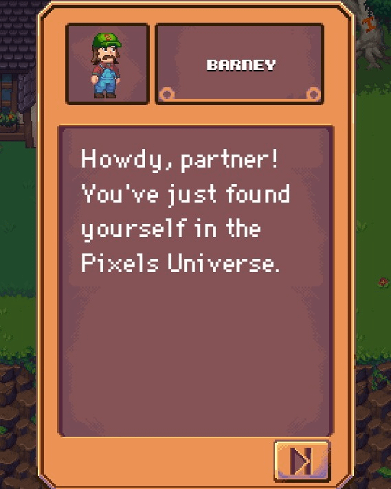 Luego BARNEY nos dió la bienvenida en su granja y en el Universo @Pixels 🥳🎉🎊.