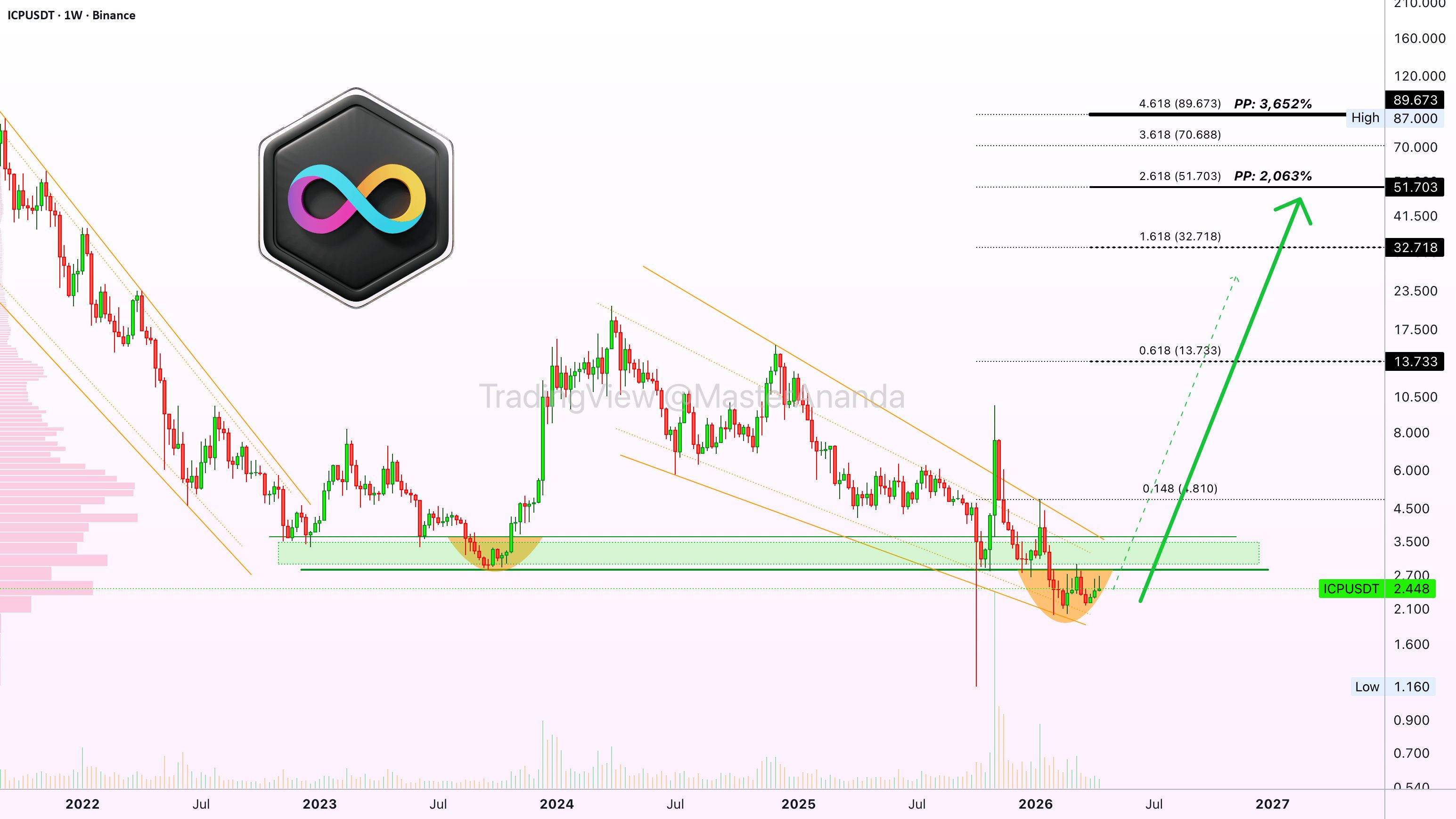 The chart here shows the start of a new bullish cycle. ICPUSDT hit a new all-time low late last year and in early 2026 has been in the process of creating a recovery pattern—change.