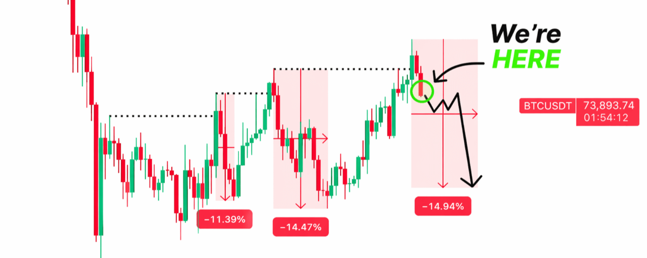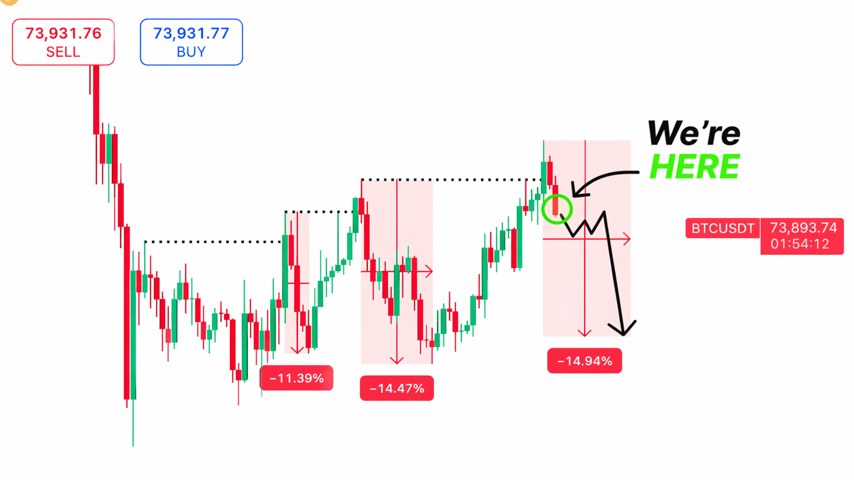 Najłatwiejszym scenariuszem jest to, że Bitcoin może doświadczyć reakcji spadkowej. W łagodniejszym przypadku cena tylko zeskakuje po likwidacji w interwale 1H, zanim wróci. W cięższej sytuacji, jeśli presja sprzedaży będzie silniejsza i utworzy się 'sztorm' w interwale 1H lub nawet 4H, cena może cofnąć się do strefy IFVG wokół 72kxx–73kxx, aby zrównoważyć płynność.