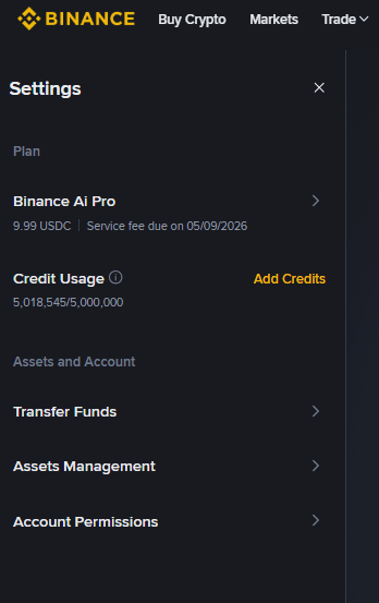 Your AI Account is completely separated from your main wallet, the API key has strict permission limits (no withdrawals, no transfers), and the system automatically switches to basic models when credits run out so trading doesn’t stop entirely. It’s a thoughtful safety design that shows Binance is serious about risk management.
