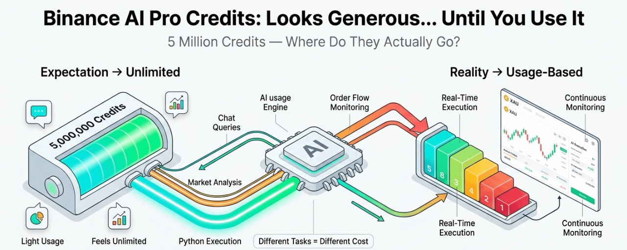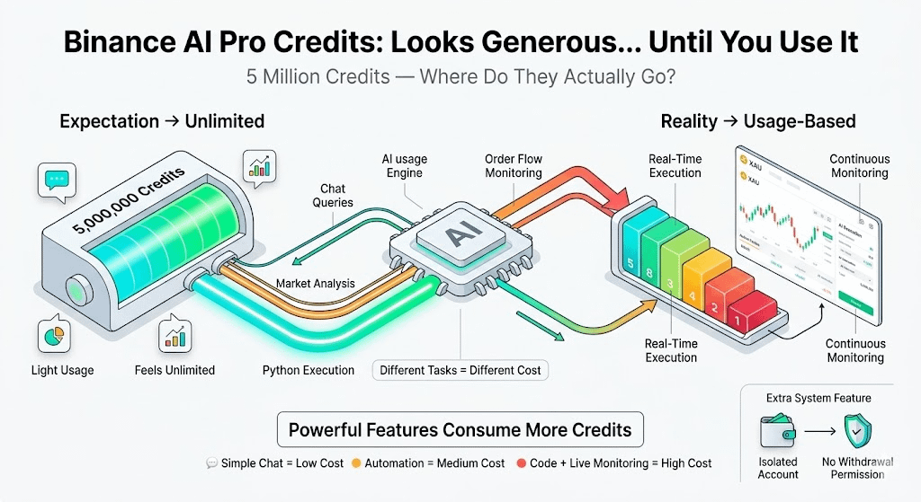 what surprised me most wasn’t the consumption rate itself. It was how invisible the real cost felt until I was already deep into using it. Binance AI Pro doesn’t just chat with you like a regular AI assistant. It can write and execute actual Python code, run continuous market monitoring, and manage live positions. Those advanced capabilities are genuinely powerful, but they consume credits at a much higher rate than simple chat queries. The documentation is honest about this, yet the difference only becomes clear once you’re running heavier workloads in real market conditions.