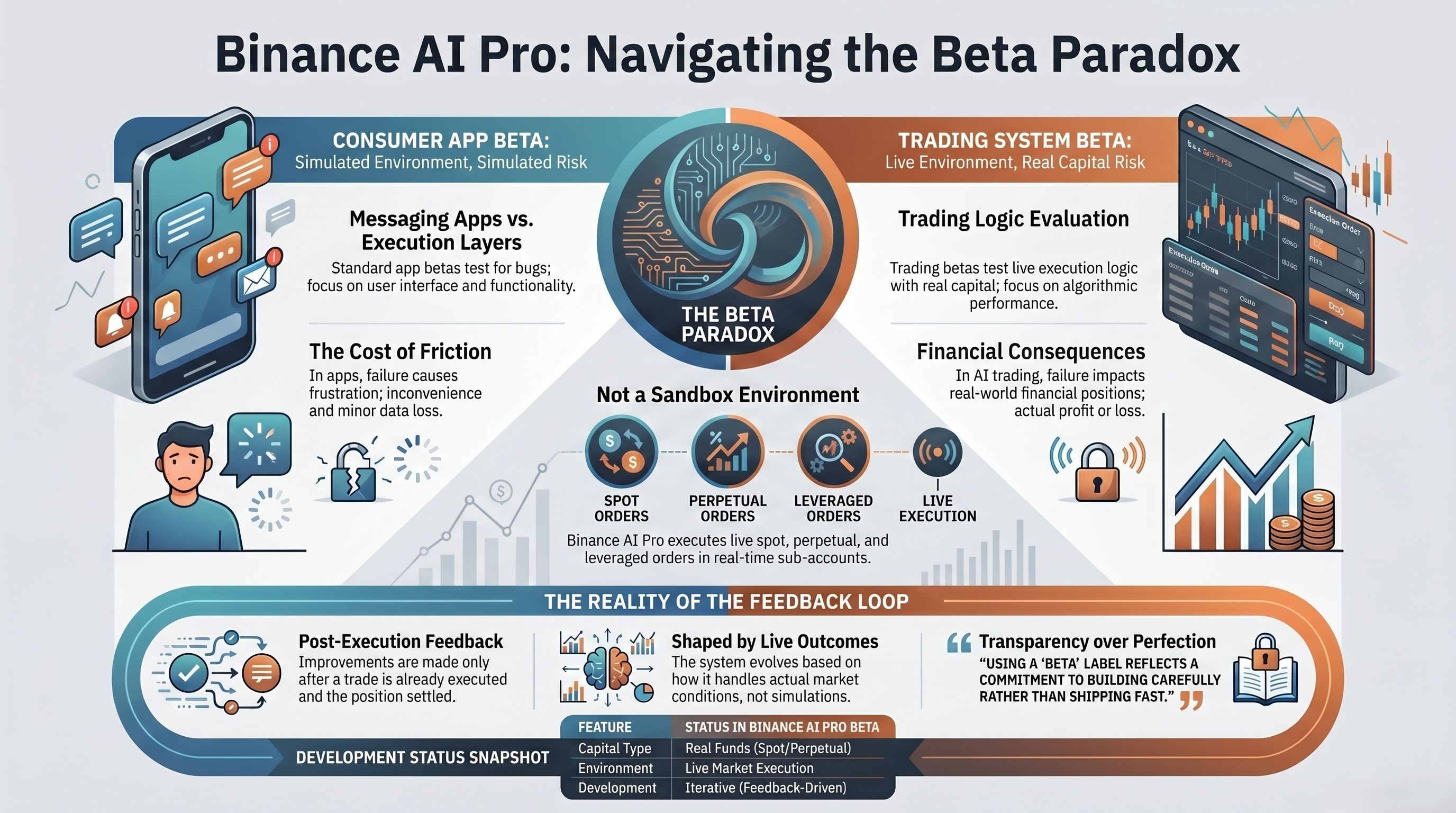 Câu hỏi đặt ra là liệu người dùng tham gia bản beta có hiểu rằng phản hồi mà Binance yêu cầu sẽ được tạo ra từ chính trải nghiệm giao dịch thực tế của họ hay không, hay họ đang coi quyền truy cập bản beta như là quyền truy cập sớm vào một sản phẩm hoàn chỉnh thay vì tham gia vào một hệ thống vẫn đang được định hình bởi chính những kết quả mà họ sắp trải nghiệm.