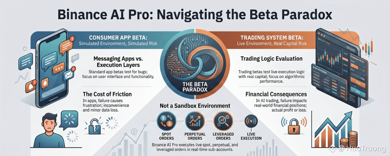 Bởi vì sản phẩm họ đang mô tả là có thật. Binance AI Pro thực hiện các lệnh giao dịch giao ngay và vĩnh viễn, quản lý vay đòn bẩy và chạy logic chiến lược tùy chỉnh một cách tự động bên trong một tài khoản phụ đang hoạt động. Nhãn "beta" mô tả giai đoạn phát triển của sản phẩm, chứ không phải mô tả số tiền trong tài khoản phụ là tiền beta.