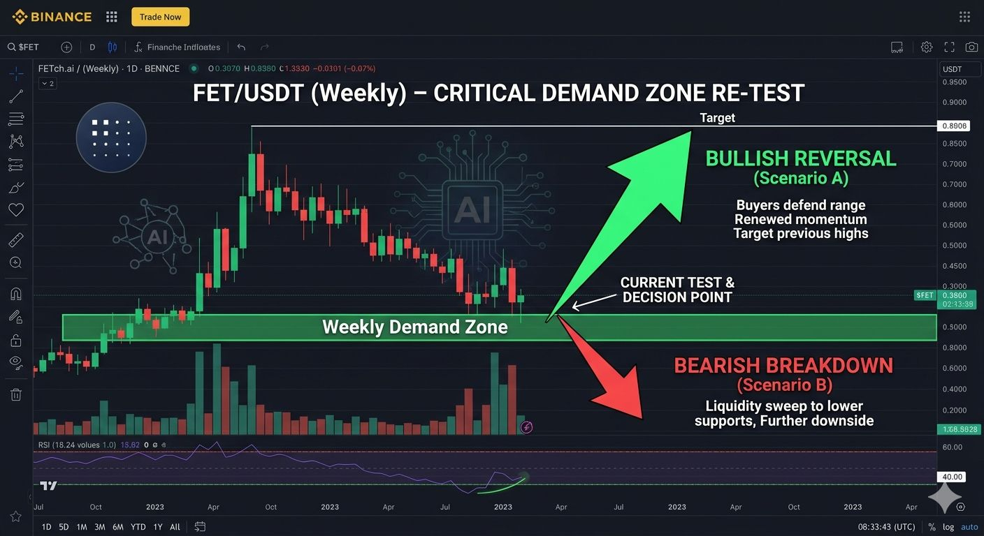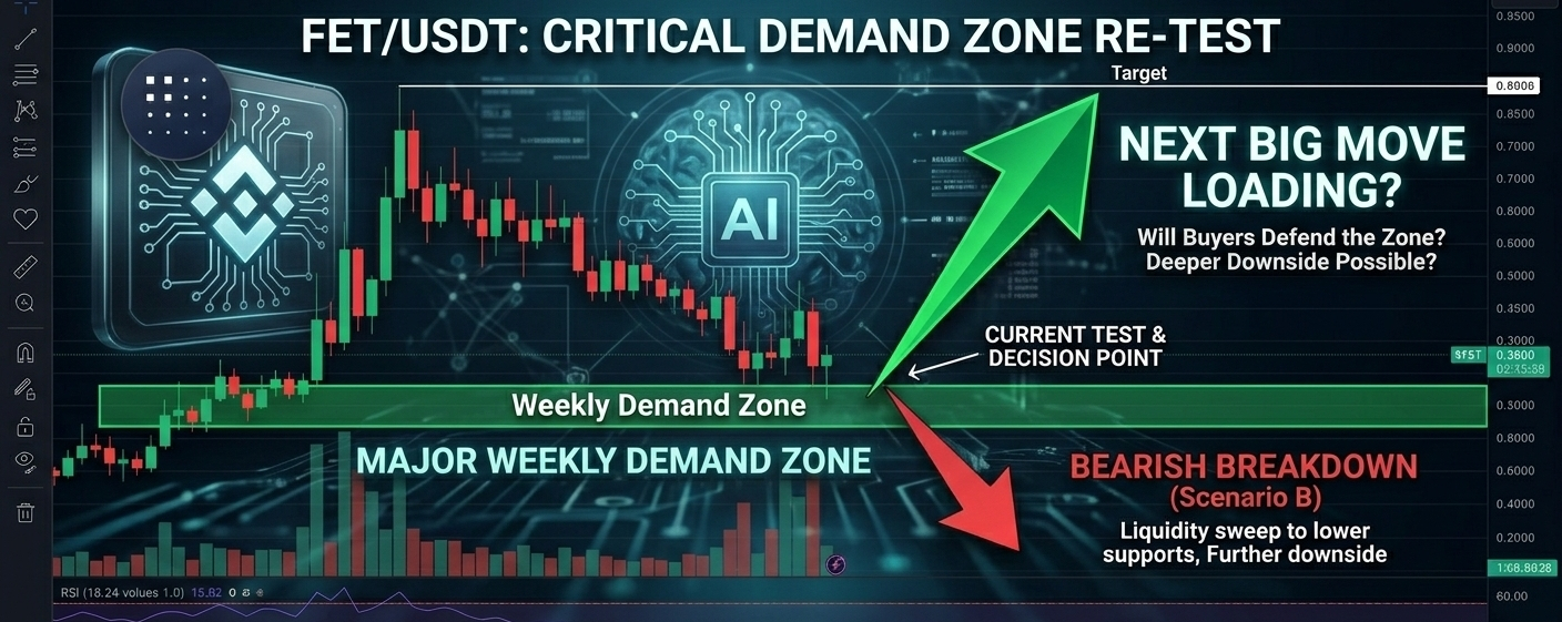$FET ponownie znajduje się w krytycznej strefie popytu tygodniowego, poziomie, który historycznie wywoływał silne reakcje w ruchu cenowym.