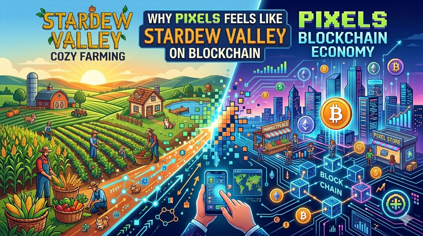 Pixels is like Stardew Valley because it's chill to play and has farming, but it adds to that by letting you own things, trade, and earn money with blockchain.