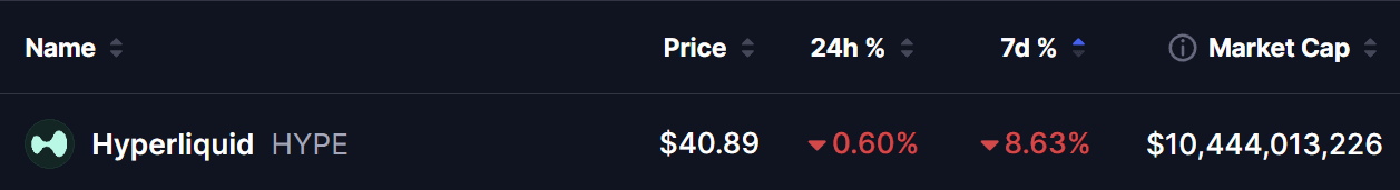 Natywny token Hyperliquid $HYPE handluje blisko 40,89 USD, spadając o ponad 8% tygodniowo.