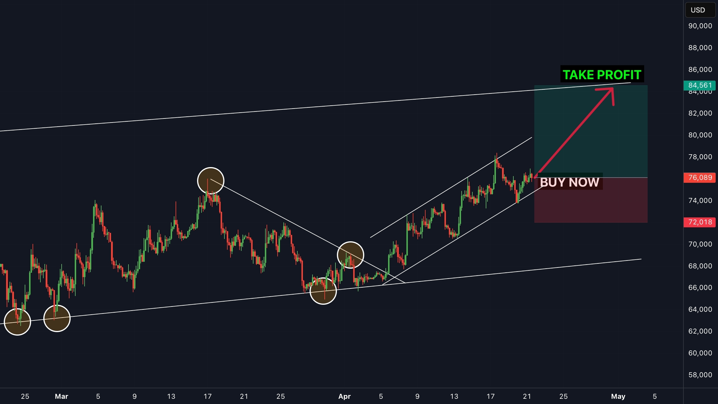 BITCOIN (BTC/USD). Kilka tygodni temu cena przełamała silny poziom oporu (biała linia trendu pokazana na wykresie) - Cena obecnie zmierza w górę i nie ma dużego oporu w pobliżu obecnej ceny, więc bardzo prawdopodobne jest, że będzie rosła (następny główny poziom oporu oznaczony jako take profit) ... USD również osłabił się z powodu trwającego zawieszenia broni w wojnie irańsko-amerykańskiej. Czas na zakup BITCOIN!