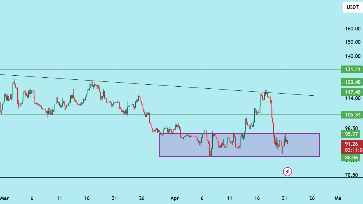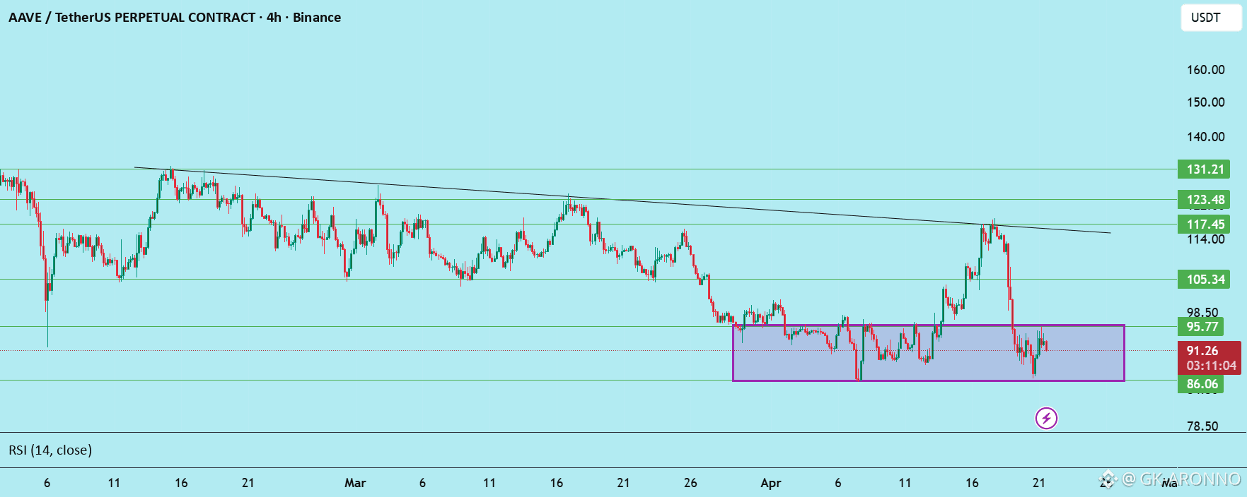 AAAVE/USDT is currently trading inside a well-defined accumulation range between 86 – 96, following a broader downtrend marked by a descending trendline from higher levels.