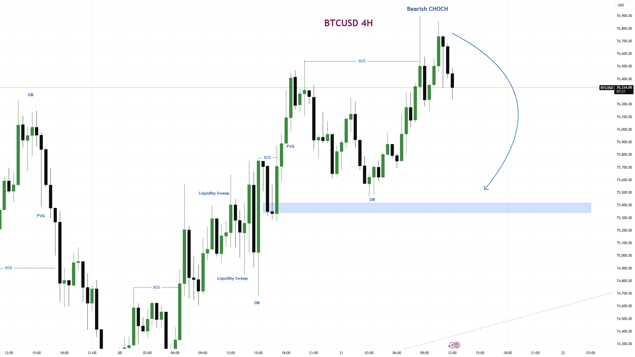 Jednak kluczowa zmiana zachodzi na szczycie, gdzie formuje się Niedźwiedzi CHOCH (Zmiana Charakteru). To sygnalizuje, że byczy impet słabnie, a smart money może rozdzielać pozycje. Po tym cena zaczyna odrzucać z strefy premium w pobliżu niedawnych szczytów. Oznaczony Blok Zamówień (OB) poniżej działa jako potencjalny cel, podczas gdy duża zakrzywiona strzałka sugeruje przewidywany niedźwiedzi ruch w kierunku tej strefy popytu.