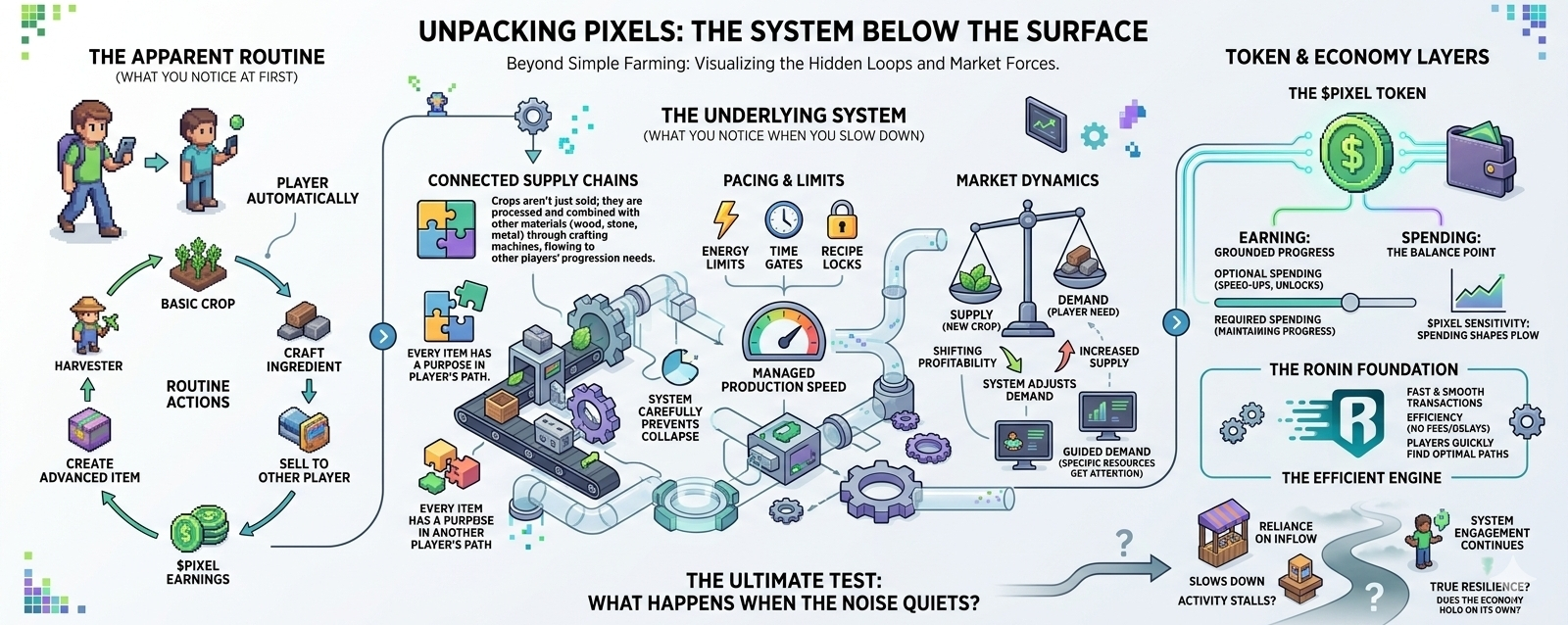 Most people still explain Pixels in the easiest way possible. A farming game with a token. Grow, harvest, earn $PIXEL, maybe trade a few items. That version works if you’re just passing through.