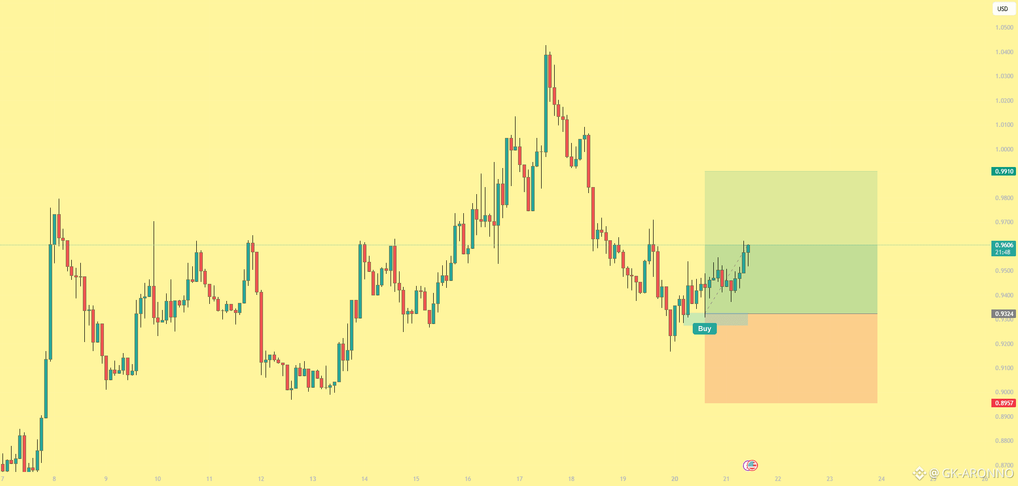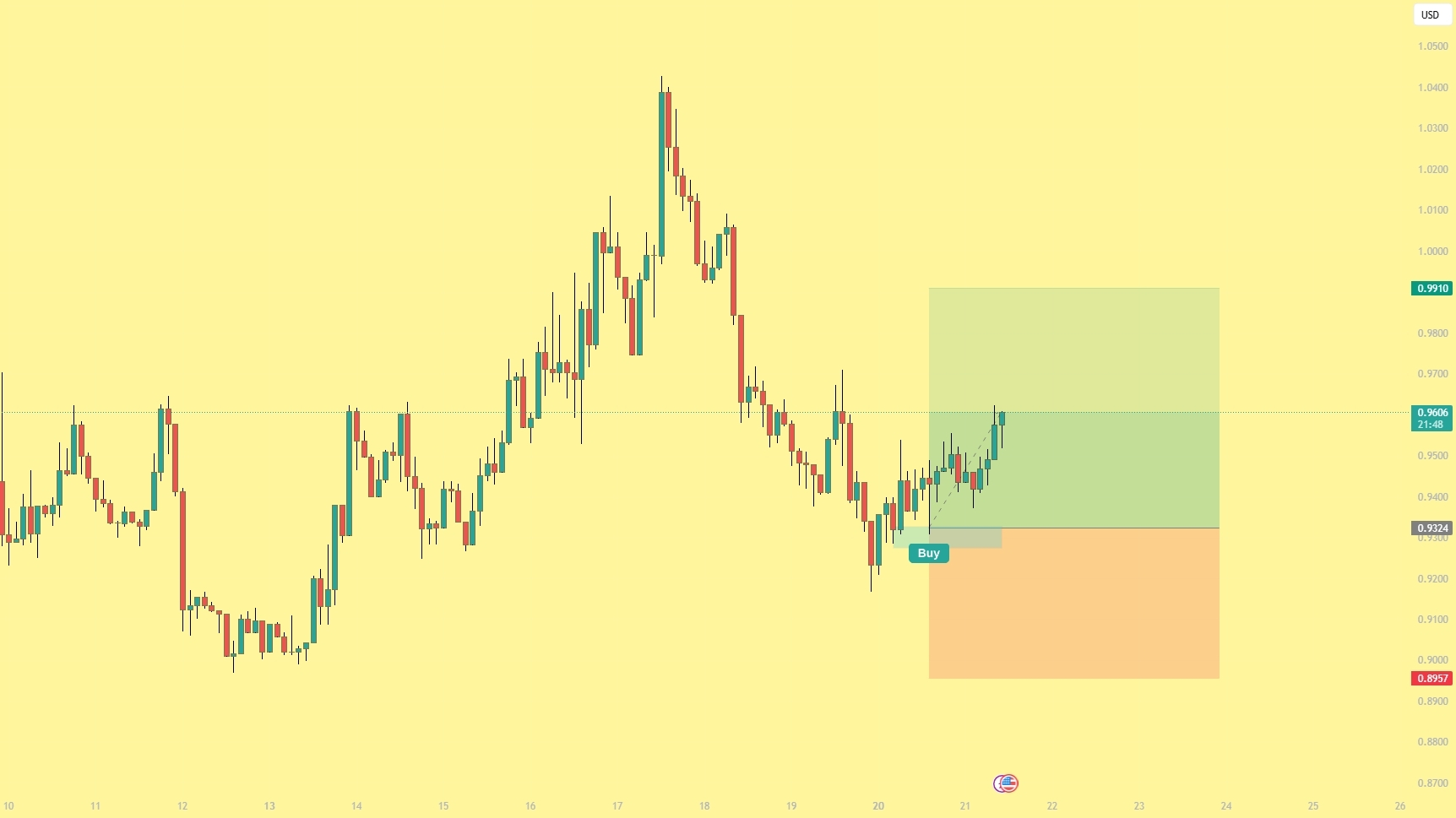 Liquidity sweep and reclaim — price wicked below 0.93, grabbed stops from previous longs, then reversed sharply. The sweep-and-reclaim is one of the highest probability entry patterns