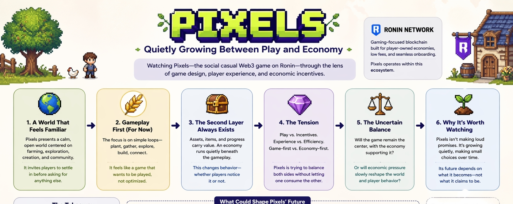 Wiele projektów wydaje się zaczynać od przeciwnego kierunku. Zaczynają od systemów—tokenów, nagród, mechanik, które muszą działać—i potem próbują owinąć grę wokół nich. Można to poczuć podczas gry. Świat istnieje, ale wydaje się drugorzędny, jakby był tam, by wspierać coś innego. Pixels nie całkowicie umyka temu uczuciu, ale też nie wchodzi w to głęboko. Trochę się powstrzymuje.