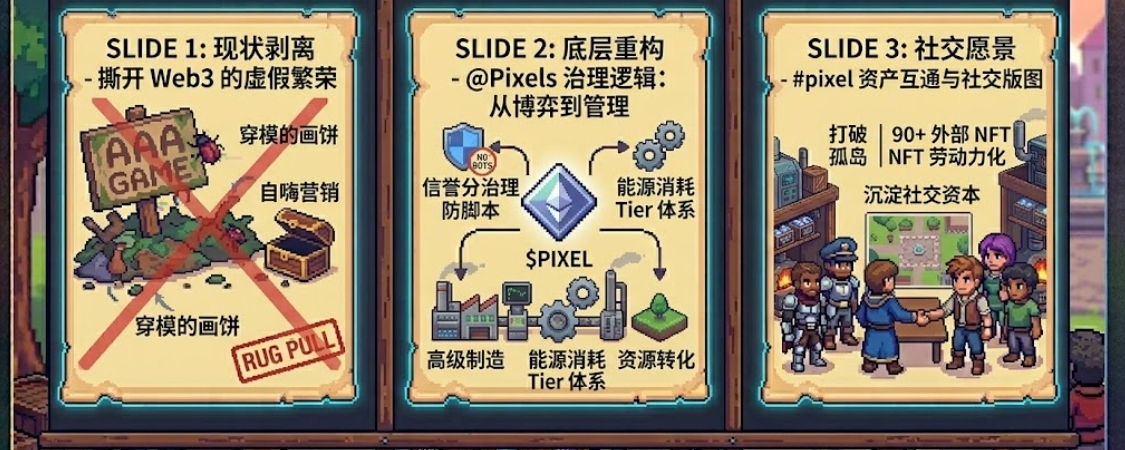 在这种乱象中,@Pixels 展现出了一种截然不同的生态粘合力。通过将 90 多个外部 NFT 项目直接赋予生产力属性,它实际上是在进行一场关于资产所有权的“实用化改造”。你的 NFT 不再只是钱包里的一张贴图,而是可以进入 $PIXEL 经济循环、产生真实资源的劳动力。这种中立且务实的技术路径,让资产在不同社区间实现了真实的流转。客观而言,Pixels 的成功并不在于画风,而在于其对“信誉治理”的坚持。在 Web3 这种缺乏执法权的丛林世界里,项目方通过信誉分系统建立了一套非中心化的行为准则,这不仅是对 价值的护航,更是对所有真实玩家劳动成果的尊重。未来,#pixel 能否继续在去中心化自治与游戏娱乐性之间保持平衡,才是其能否长青的关键。
