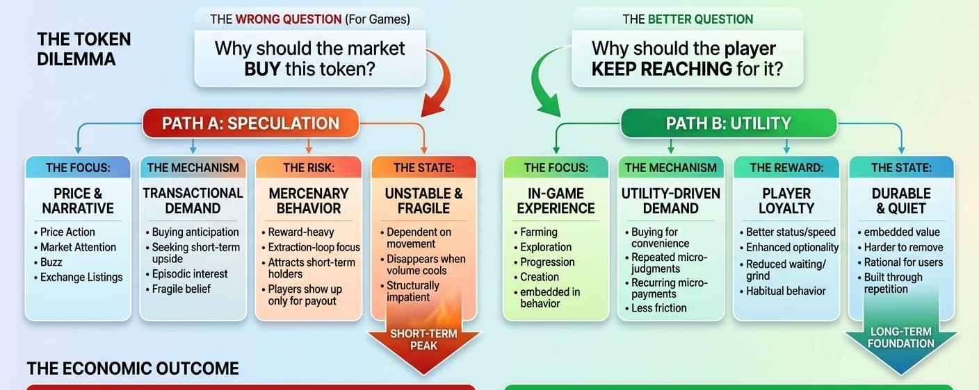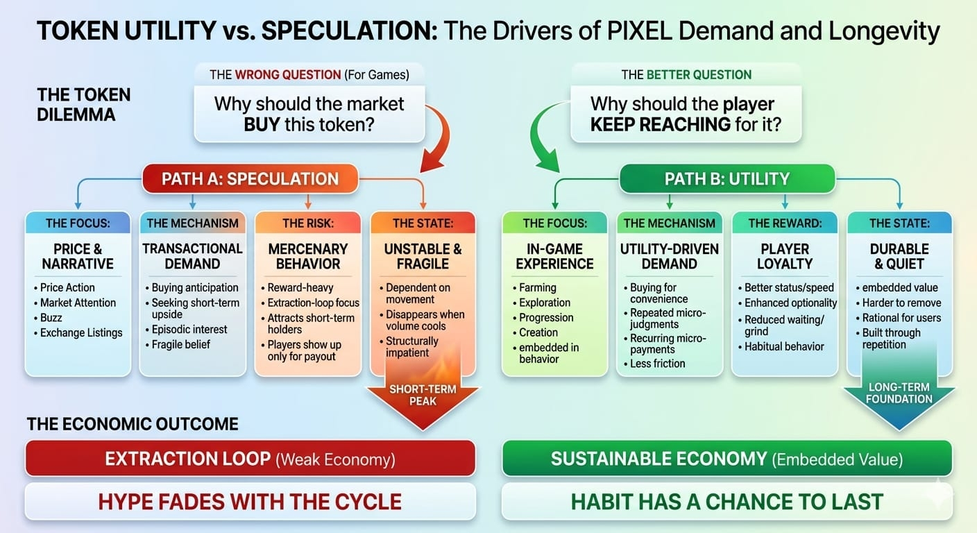 That distinction matters because it exposes the central mistake people make when evaluating gaming tokens. They ask, “Why should the market buy this token?” when the better question is, “Why should the player keep reaching for it?” Those are related questions, but they are not the same. Speculation can answer the first one for a while. Only utility can answer the second one over time.