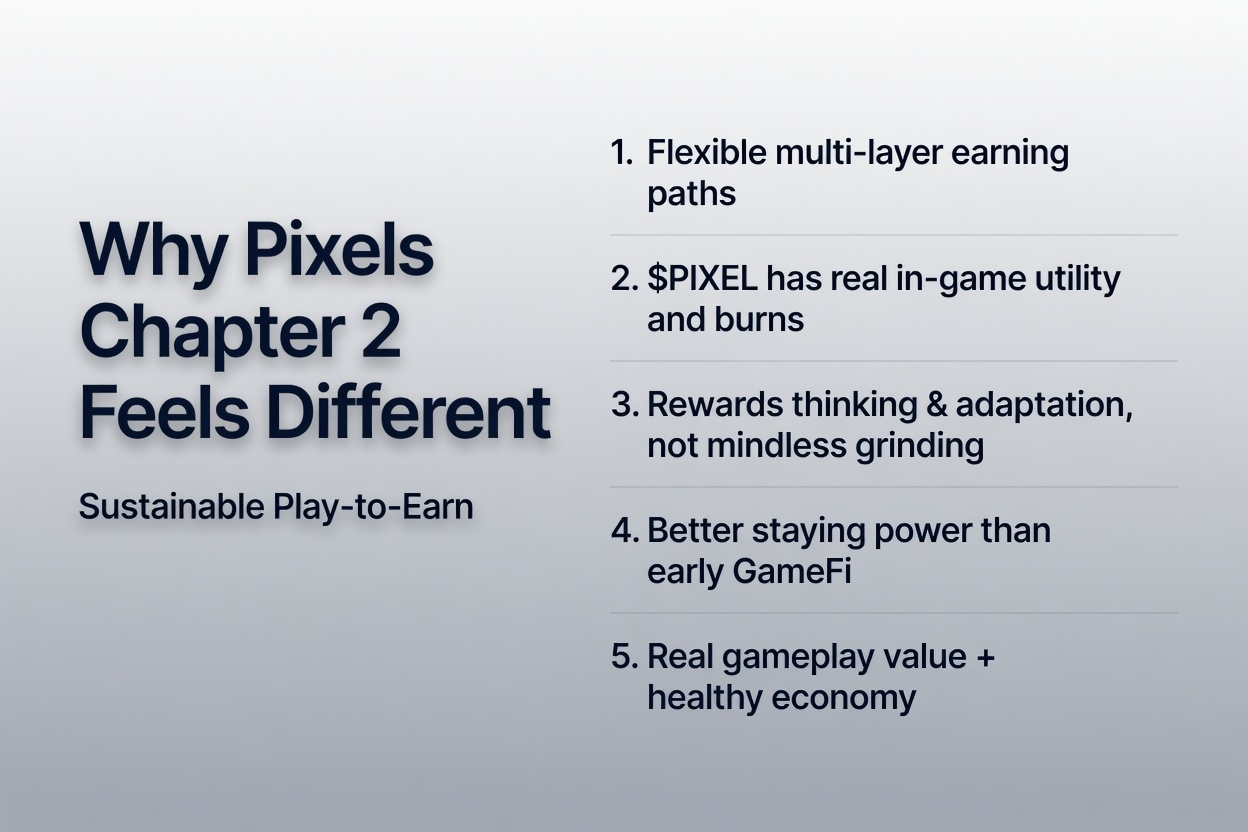Compared to the first wave of GameFi, Pixels feels more mature. Multiple earning layers give it better staying power. If one area gets too competitive and margins drop you can shift to another niche or focus more on crafting and upgrades. That flexibility keeps things interesting.