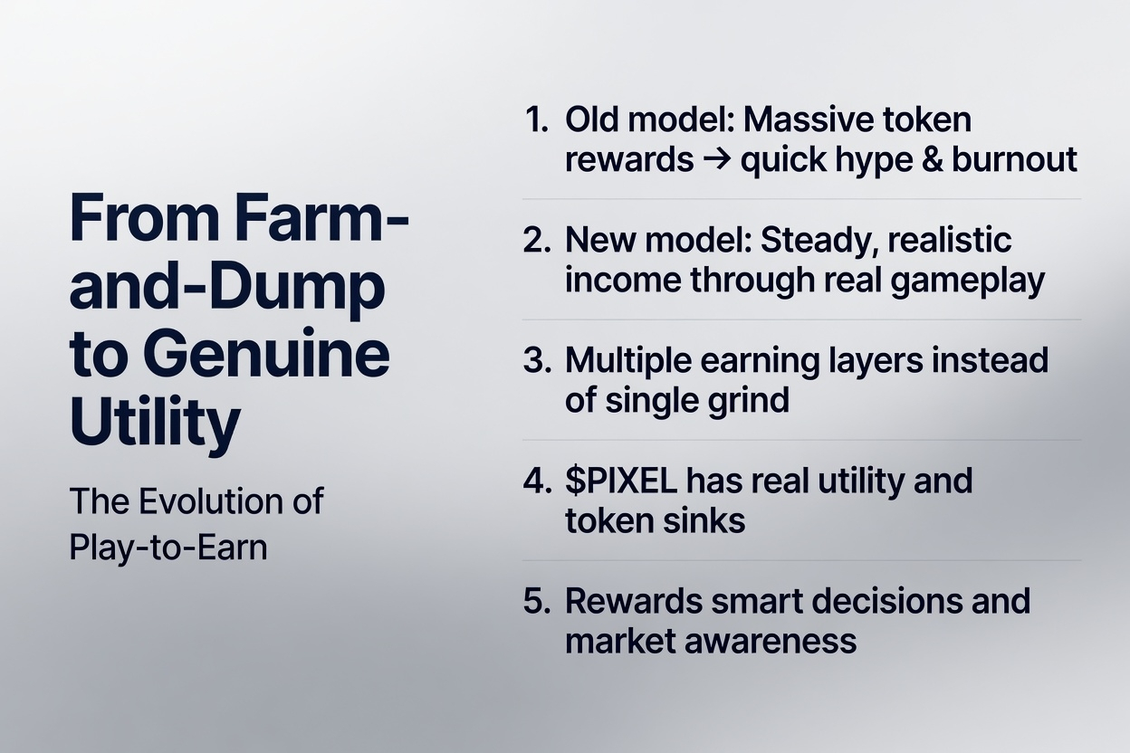The old play to earn scene was pretty rough. Early games blasted out huge token rewards to hook everyone fast But most of them burned out quick once the hype faded. Players got smarter and way more doubtful. Now its less about flashy promises and more about whether a game can actually deliver steady, realistic income through real gameplay. That is exactly why Pixels Chapter 2 stands out Especially when you look at how @Pixels fits into everything.