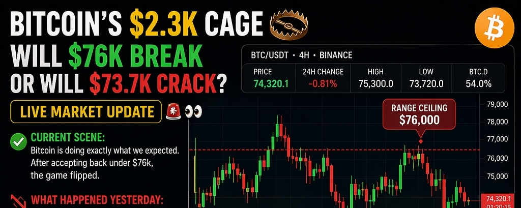 Bitcoin is playing out exactly as anticipated. After losing acceptance above $76K, momentum shifted — and now price is stuck in a tight battlefield.