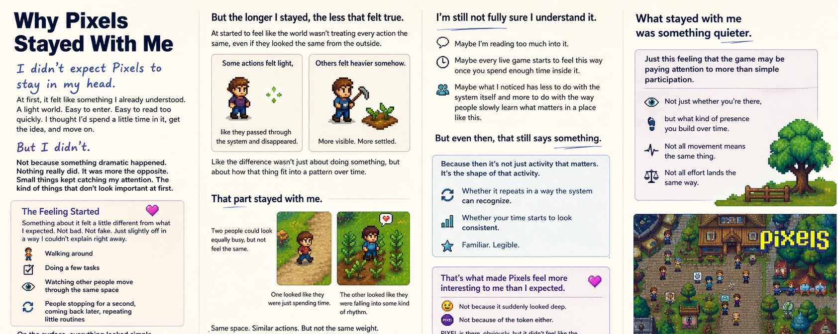I just know that once I noticed it, Pixels stopped feeling as casual as it first seemed. It still looked soft. Still looked simple. But underneath that, it felt like something was sorting actions a little more carefully than I expected.