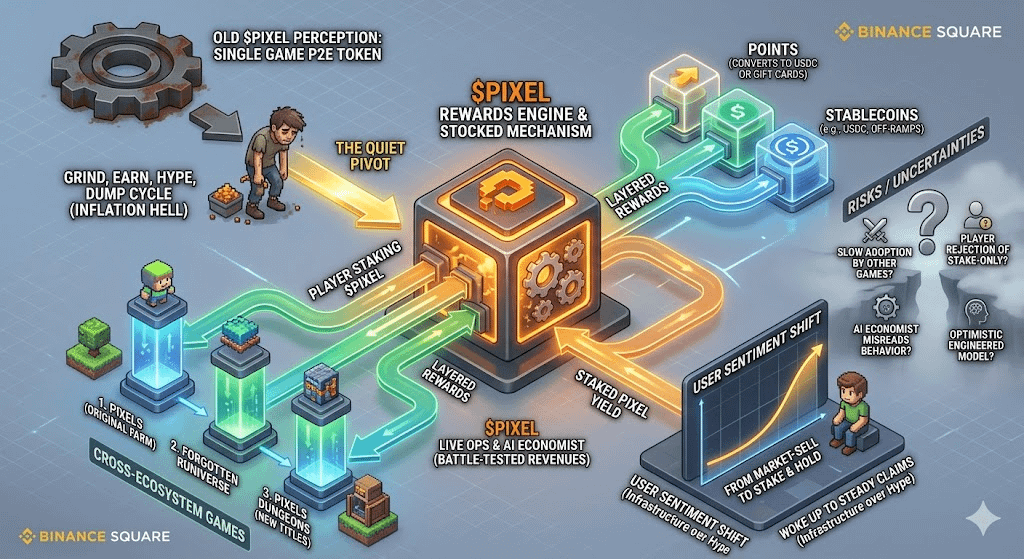 But what actually happens inside Stacked is different. You stake your pixel different projects in the ecosystem—Pixels itself, Forgotten Runiverse, Pixels Dungeons, whatever’s live. It’s not just parking it for yield in one place. The engine uses it as the backbone. Play a mission in one game, the AI tracks real behavior, and rewards stack on top—PIXEL for staking, sure, but also these new points and even direct USDC off-ramps. It’s like the token stopped being the flashy prize and became the quiet engine oil that keeps multiple games running smoother. I tried it last night with a tiny bag, split between two games just to test. Woke up to small but steady claims. No hype, just… working.