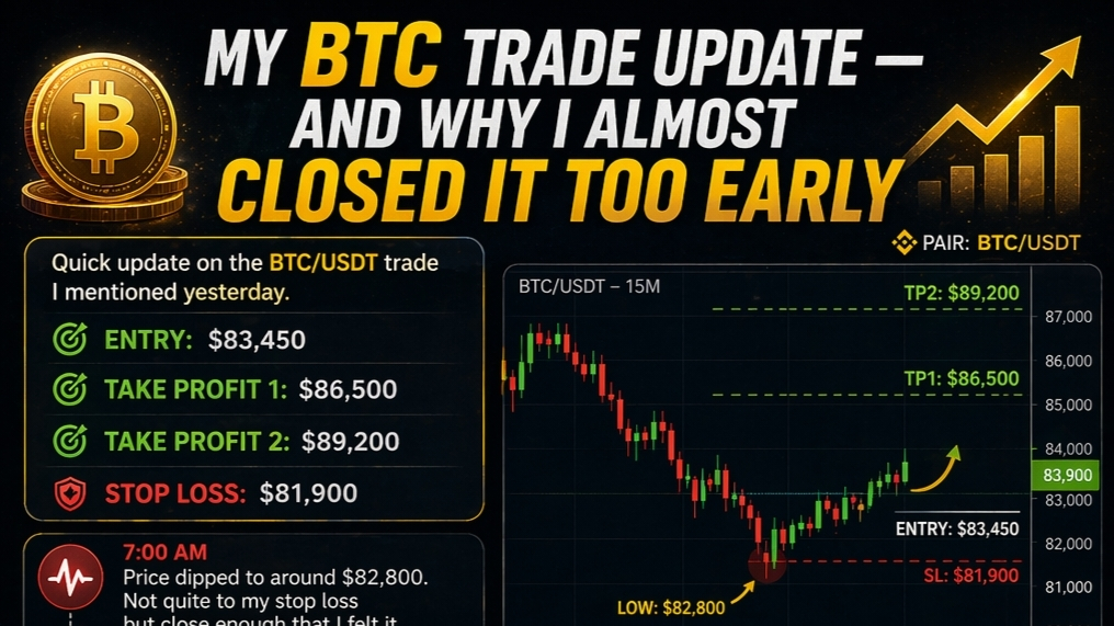 This morning price dipped to around $82,800. Not quite to my stop loss but close enough that I felt it. You know that feeling when you're watching a position go slightly against you and your finger hovers over the close button? Had that feeling at around 7am.